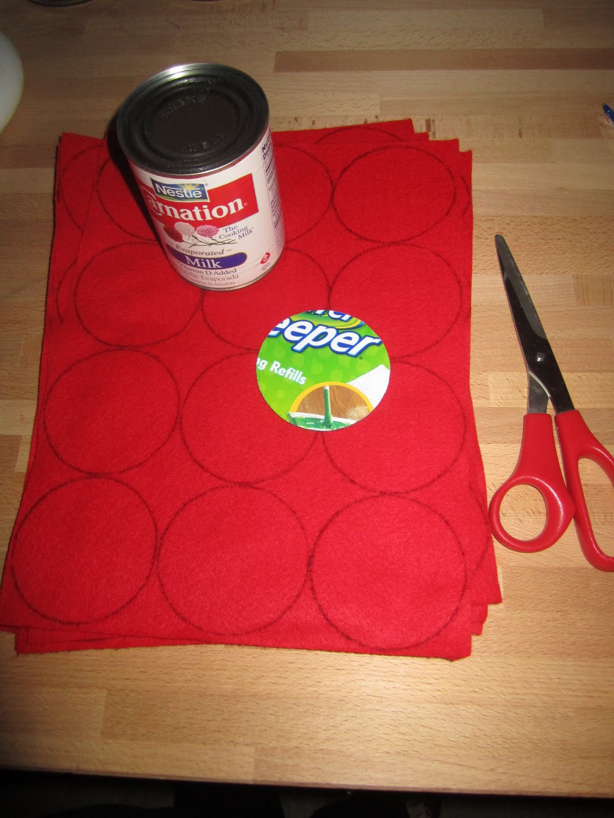 You will also need to make a circle form to trace and cut out the felt with. I used part of a Swiffer Sweeper box that I had just emptied and traced a Carnation evaporated milk can for the size I wanted.